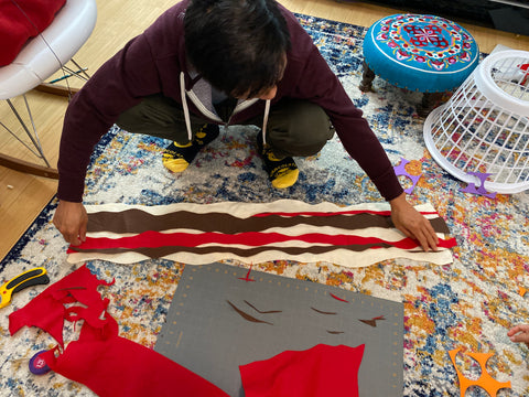 Attach one side to the laundry basket. I used three pieces of cardboard like this to attach it. Leave the other side unattached so you can climb in and out of the costume.